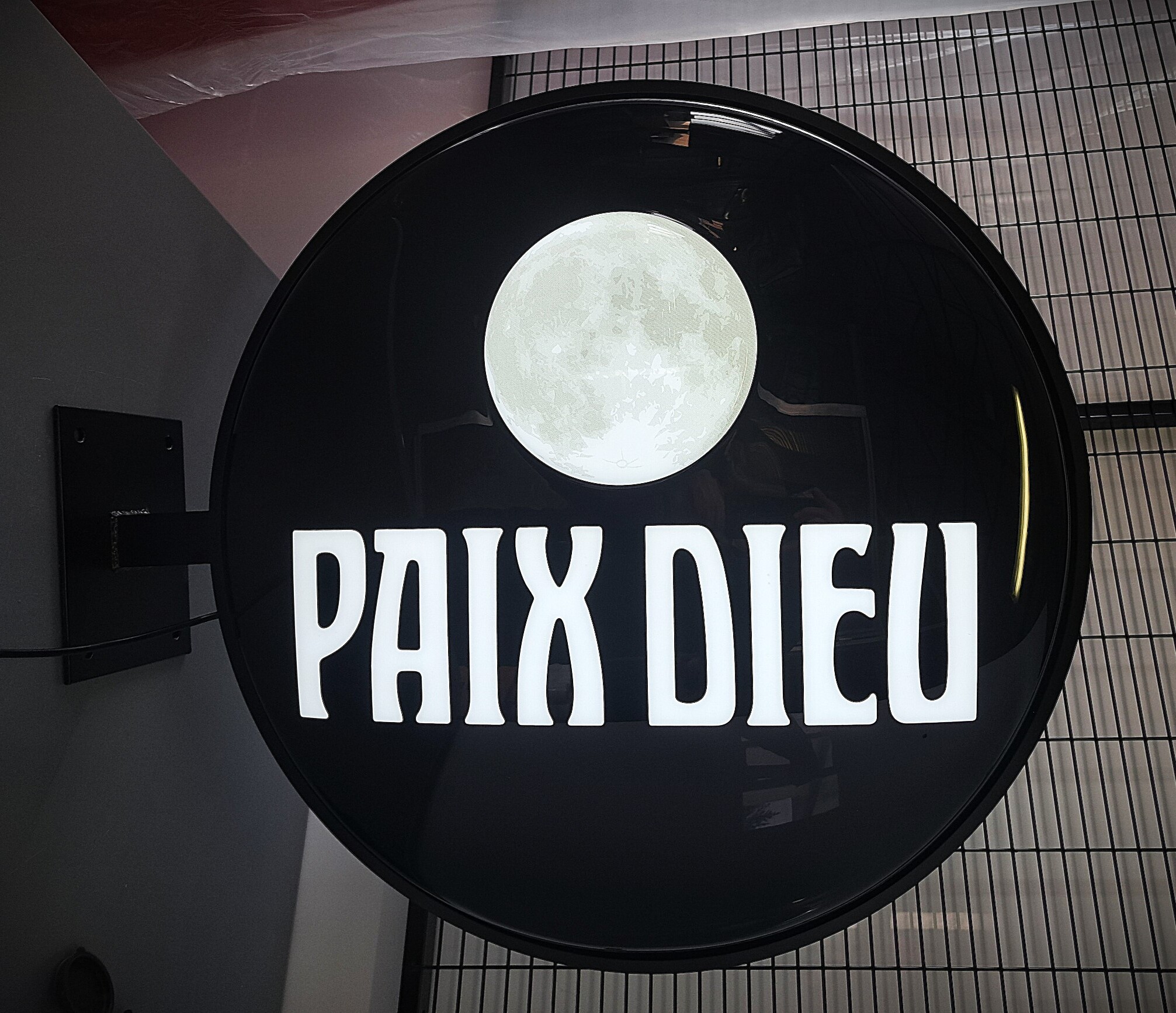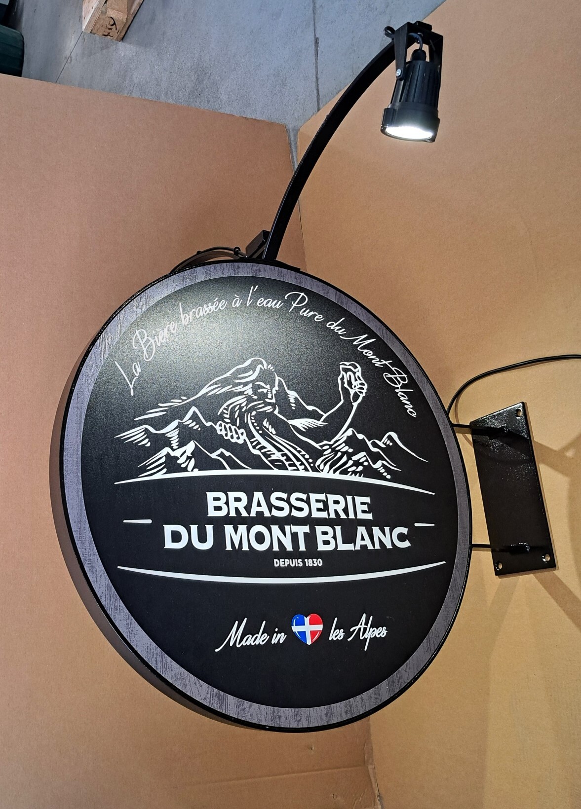 Dwustronny metalowy kaseton zewnętrzny Brasserie Du Mont Blanc – reklama świetlna LED